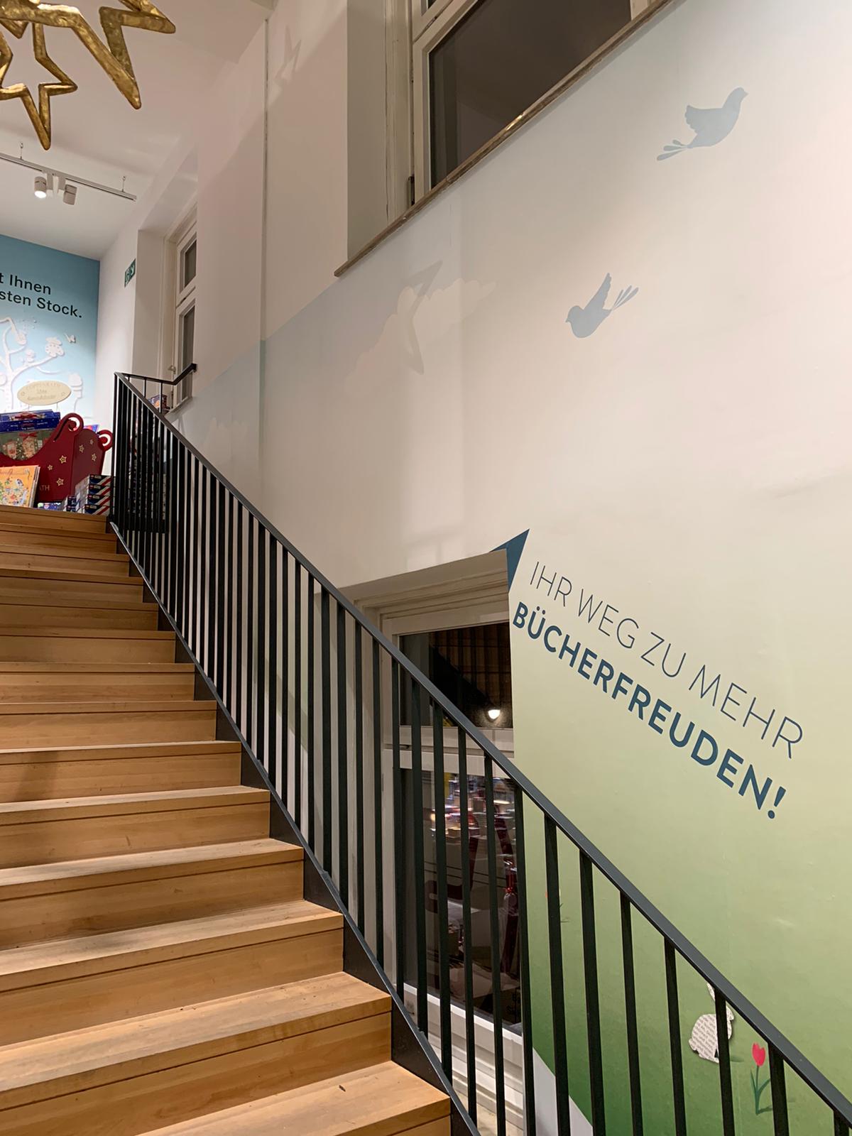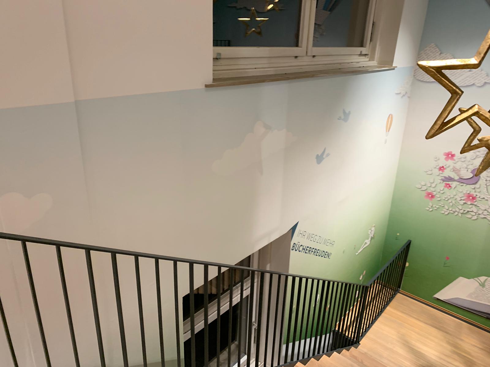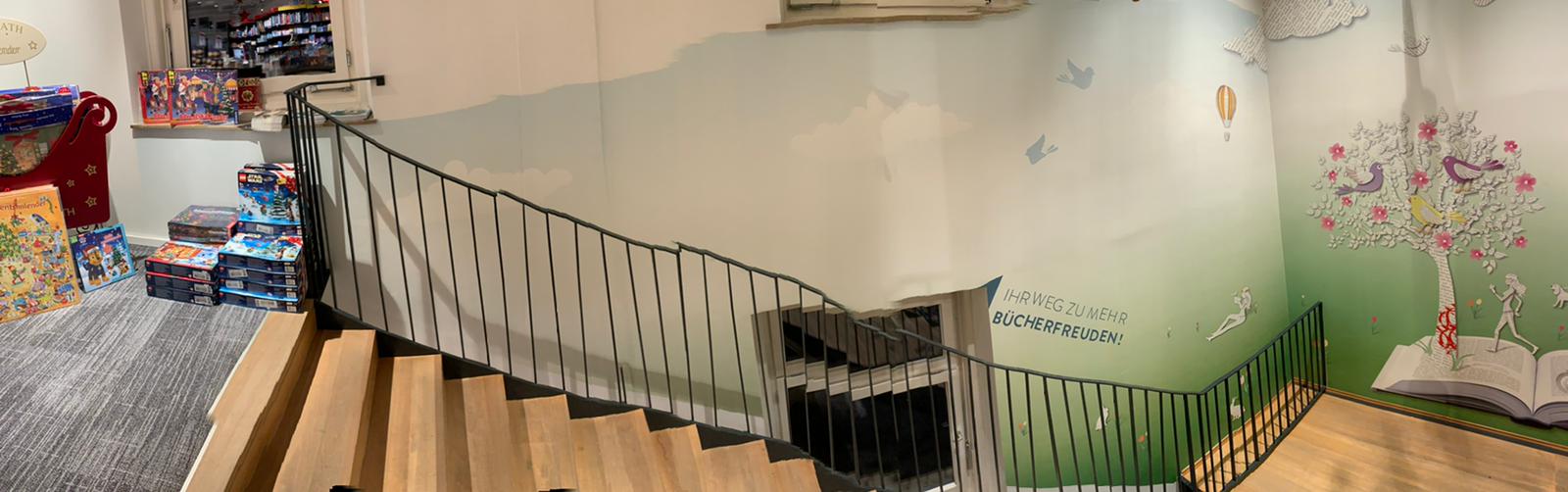 Die Treppenhausgrafik bei Hugendubel in München wurde zu einem echten Highlight. Sie verlieh dem Buchladen nicht nur eine einzigartige ästhetische Dimension, sondern schuf auch eine anregende Umgebung für Kunden und Besucher.